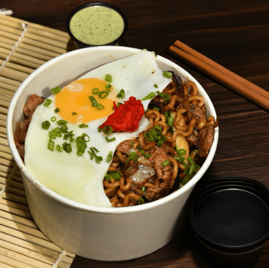 Fideos especiales YAKISOBA. Con lomo de cerdo en cortes, sake y una mezcla exclusiva de salsas kushiage y de ostras. Acompañado con huevo frito y gari (gengibre encurtido).
